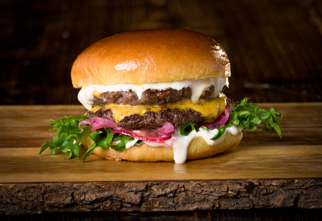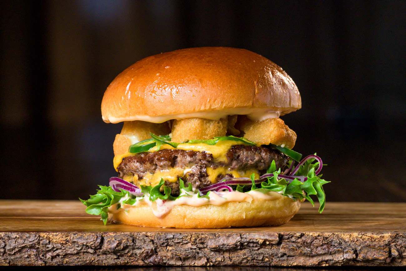 Svenskt nötkött, dubbla patties (200 g), tryffeldressing, krispig sallad, picklad rödlök och cheddarost.